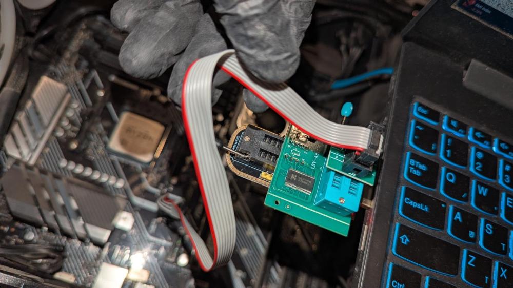 סבבה, הצלחתי להוציא את הקירור, הייתי חייב כי זה חסם קצת את הגישה לצ'יפ. חיברתי הכל, ניסיתי איזה 10-15 פעמים לחבר את השיניים של הצורב, גם יש עוד איזה כמה פינים ליד הצ'יפ שמקשים על הגישה ממש. בכל מקרה, לא הצלחתי להגיע למצב שזה מצליח לקרוא את הצ'יפ. חשבתי אולי דרייברים של הצורב, התקנתי 2, לא ראיתי שזה מזהה אותו הdevice manager. אבל התוכנת צריכה אולי כן מזהה. אוסיף קצת תמונות. בכל מקרה אני כבר בערך חצי דרך ללהחליף לוח אם.