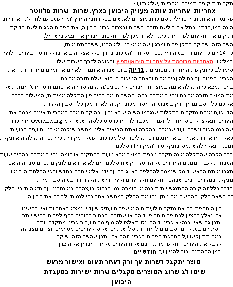 פורסם 2018 באוקטובר 217 שנים מחבר *** עדכון: יצא לי שוב לדבר עם חברת פלונטר(היום) בנושא אבל אין להם מענה בשבילי, הם טוענים בגלל שהכרטיס יצא כניראה מהשוק או חוסר מבחינת הייצור, אז דברים מתעכבים..ביקשתי גם היום לדבר עם היבואן , הם אמרו שזה יהיה מיותר כי הם לא ידברו איתי, אמרתי ננסה, התקשרתי ליבואן "מור לוי" דיבר איתי מישהו בשם ג''קי, בן אדם זוועה גועל נפש של דיבור, בגלל שאני לא חברה או שאני קניתי מפלונטר אז שהם ידברו איתו, שאלתי אותו מה קורה עם הכרטיס? הוא אמר לי " ד--ב---ר עם פלו-נ-ט-ררר אל תדבר איתי, הם שלחו לי הם שהם יצרו איתי קשר לא אתה" או במילים אחרות " אל תשגע אותי אין לי עצבים בשבילך" אני לקוח לא משנה של מי , גם אם אני מדבר אני מצפה ליחס הוגן לא מזלזל העיקר להעיף אותי, אני עכשיו מתחיל שבוע שלישי!! שבוע שלישי שאני לא יכול עבוד כמו שצריך ואת זה לאף אחד לא מעניין! העיקר שילמת! דיברתי לאחר מכן עם פלונטר שלפחות יזכה אותי אני לא יכול לקבל עבודות הפרנסה שלי,אמרו שלא משתלם לו לזכות אותי כי זה הרבה מאוד כסף 4900 ש"ח! עכשיו אני סתם באוויר מחפש את עצמי! שיהיה ברור..במשך הזמן הזה פלונטר לא יצרו איתי קשר, ומי שבדק כל הזמן הזה והתעניין זה רק אני! תקנון פלונטר: תקנון מור לוי - יבואן: נערך 2018 באוקטובר 217 שנים על-ידי shimon070