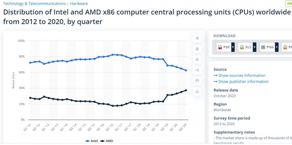 פורסם 2020 באוקטובר 85 שנים מחבר ופה יש לנו משהו מעניין, שמצאתי בשלוף: https://www.statista.com/statistics/735904/worldwide-x86-intel-amd-market-share/ הוא מתאר יחס נתח שוק עולמי גלובאלי של 60/40