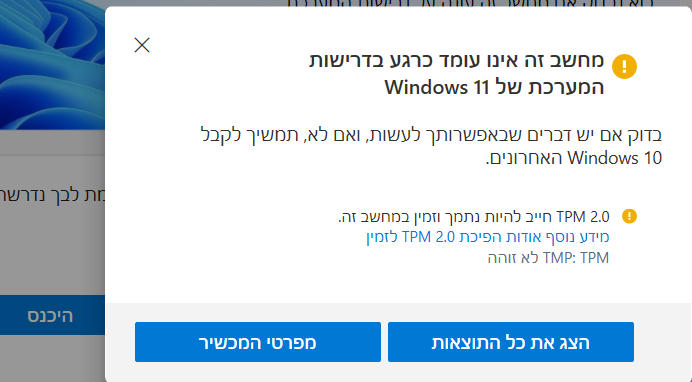 פורסם 2021 באוקטובר 184 שנים ציטוט של law89 מה הדרישות מינימום להתקנה? לא אמרו דור 8? יש לי הודעה במחשב הישן שאני לא יכול להתקין דור 8 נתמך, כנראה נכשל על משהו אחר, תרשום מה השגיאה שאתה מקבל. מהאתר כאן אתה יכול להריץ את ה TOOL שמפרט לך על זה עובר ו או נכשל. https://windowsreport.com/pc-health-check-app-windows-11/