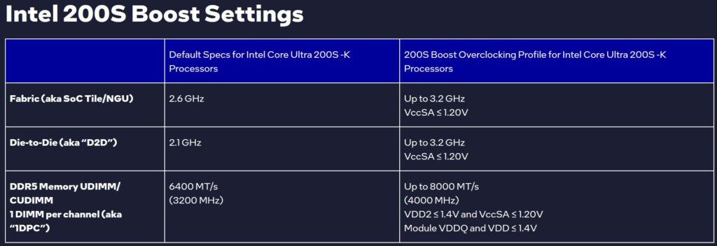 הטכנולוגיה החדשה מיועדת אך ורק למעבדים מהסדרה Core Ultra 200K – דגמים בעלי מכפלה פתוחה, המיועדים מראש להמהרה. הפרופיל החדש מבצע שינויים בכמה מרכיבים קריטיים של השבב: תדר רכיב התקשורת (NGU) עולה מ-2.6GHz ל-3.2GHz, תדר החיבור בין אריחי הסיליקון (D2D) מזנק מ-2.1GHz ל-3.2GHz, ומהירות הזיכרון מסוג DDR5 מגיעה עד ל-8000MT/s, כאשר מדובר במודול בודד לכל ערוץ ובתמיכת פרופיל XMP.