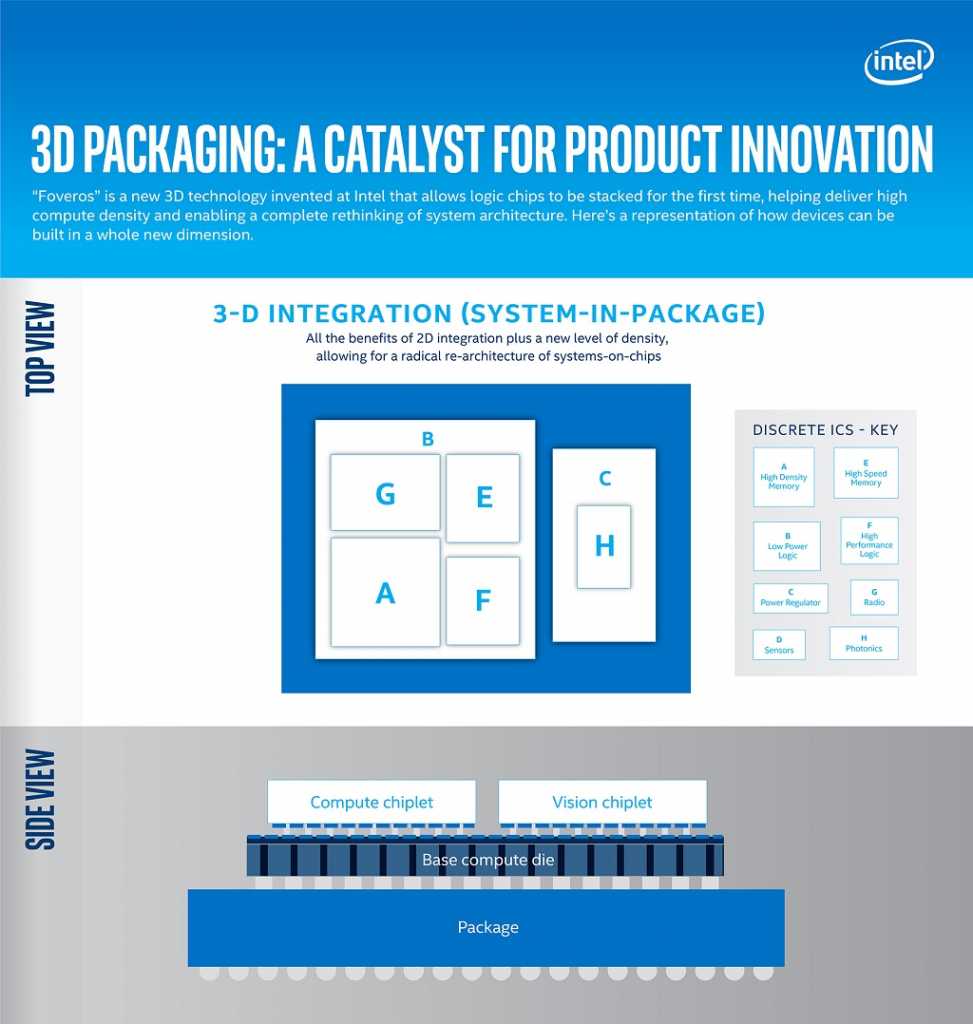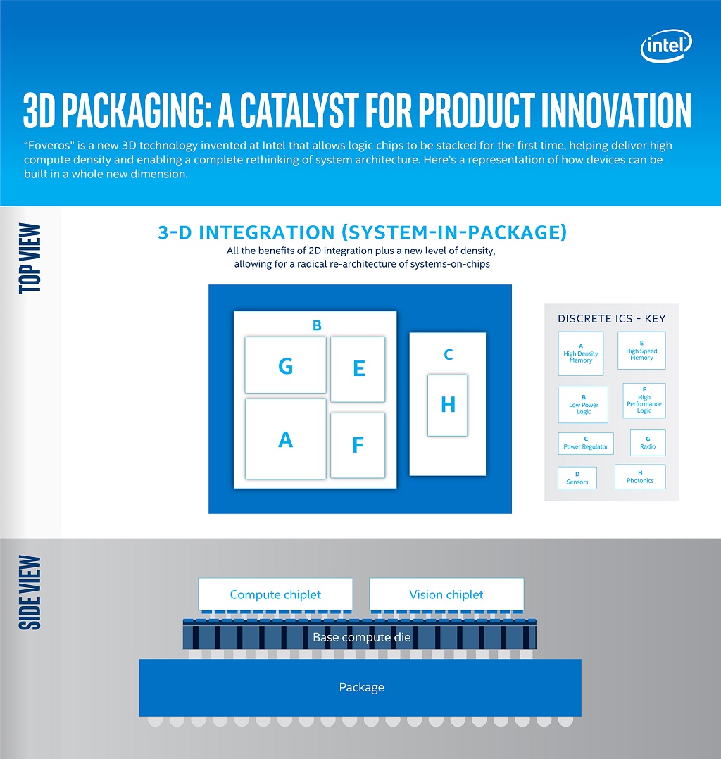 באינטל מבינים בשביל ליצור מעבדים מורכבים וגמישים יש צורך לעבוד בשיטה שונה. נראה שהשיטה לדפיס את כל רכיבי הליבה בתור מקשה אחת של סיליקון מחפשת פרישה קלה. באינטל קוראים לזה 3D Packaging, היכולת "לשחק" עם כמות הליבות וסוגי הבקרים.