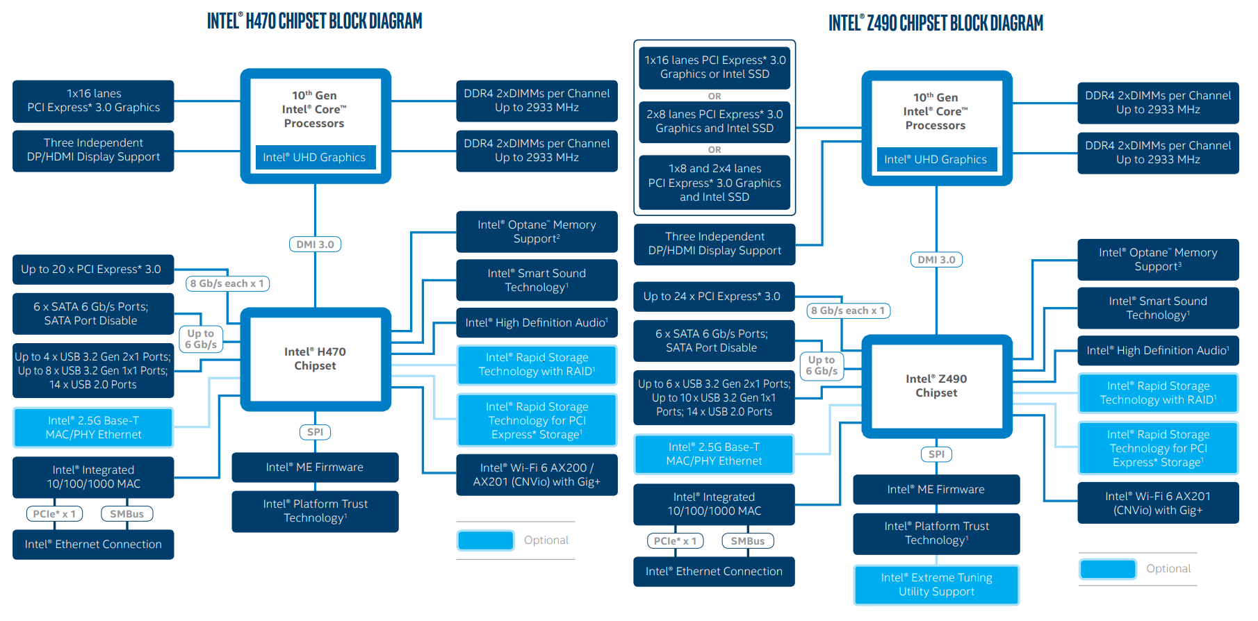 לפניכם תרשימים של שתיים משלוש ערכות השבבים הדומיננטיות של תושבת LGA1200 החדשה. בשלב זה אנו כמובן מציינים שאין תמיכה אחורנית במעבדי Coffee-Lake בתושבת זאת, כמו גם אין תמיכה למעבדי Comet Lake S בתושבת LGA1151 הקיימת.