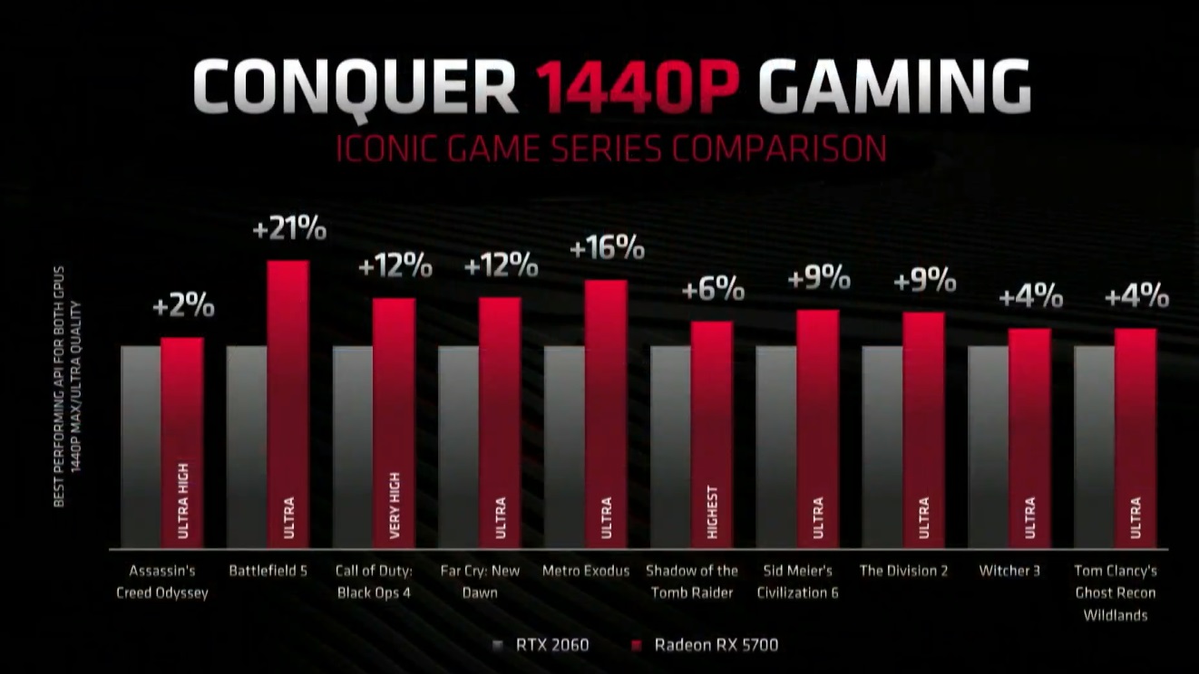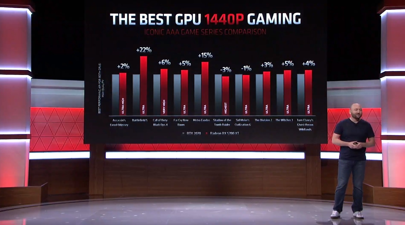 ה-Radeon RX 5700 XT שם לו לתחרות את ה-RTX 2070 המוצלח של NVIDIA. מולו במבחר משחקים שבחרה AMD, נצפית הובלת ביצועים ממוצעת של כ-5 אחוזים ויותר.
