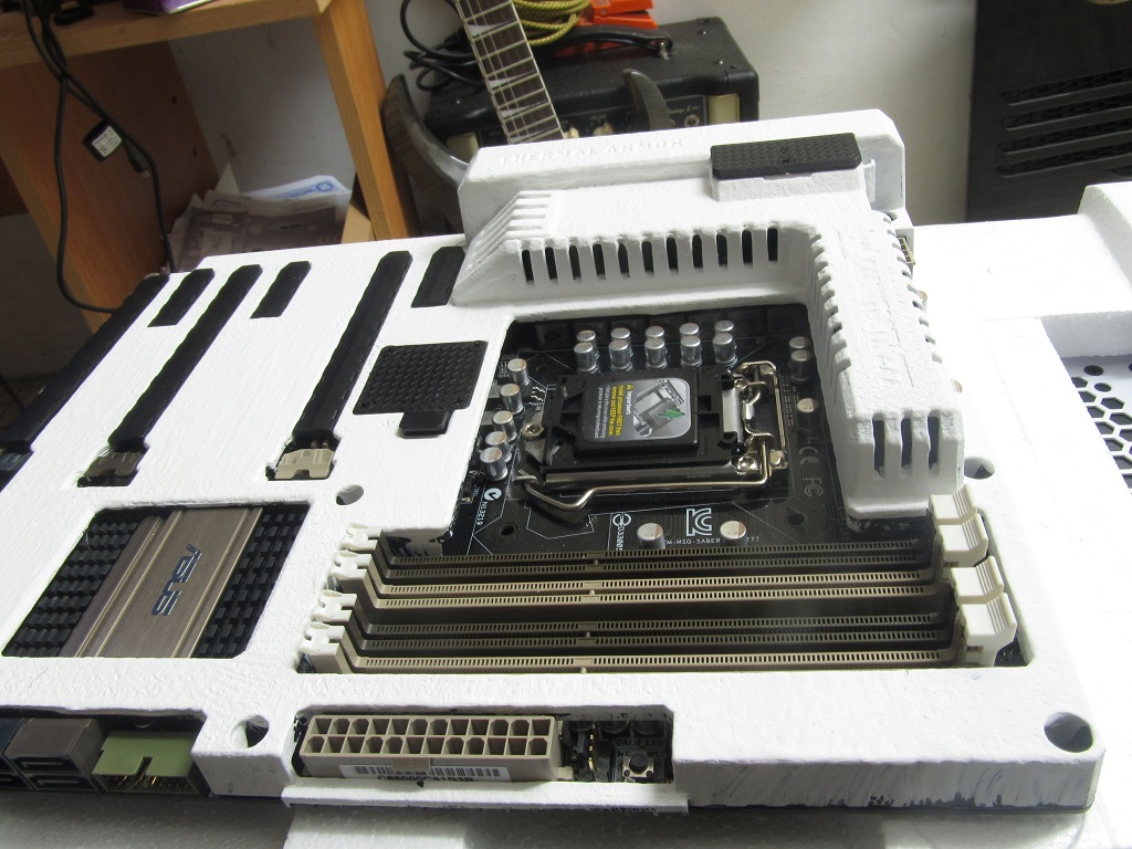 רכבתי על השלדה התרמית של לוח האם Asus Z77 Sabertooth כדי לקבל את הצבע הלבן, השתמשתי בצבע אקרילי. בתוכו יישב המעבד, Core i7 3770K של איטנל.