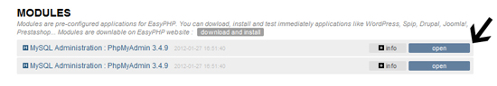 - בחלק התחתון של העמוד שנפתח לנו נראה כותרת בשם Modules. נלחץ על Open במודול הראשון (PhpMyAdmin):