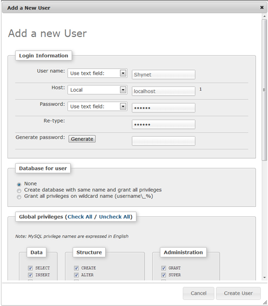 - נלחץ על "Add a new user". יקפוץ לנו דיאלוג אשר בו עלינו יהיה למלאות את פרטי המשתמש וההרשאות הקיימות לאותו המשתמש. המשתמש שניצור יהיה משתמש עם הרשאות מלאות. בתיבת ה- User nameנמלא את שם המשתמש שנרצה על מנת לגשת למסד הנתונים, בתיבת ה-Host נבחר ב-Local ובתיבת ה-Password נקליד את הסיסמא שבה אנו מעוניינים לגשת למסד הנתונים ונחזור עליה שוב בתיבה המופיעה מתחת. ב-Global Privileges נלחץ על Check All וכך ניתן הרשאות מלאות למשתמש במסד הנתונים. לבסוף, נלחץ על "Create user":