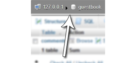 הערה: אם אתם לא נמצאים בתוך מסד הנתונים עליכם ללחוץ על לשונית ה-Databases ולבחור guestbook.