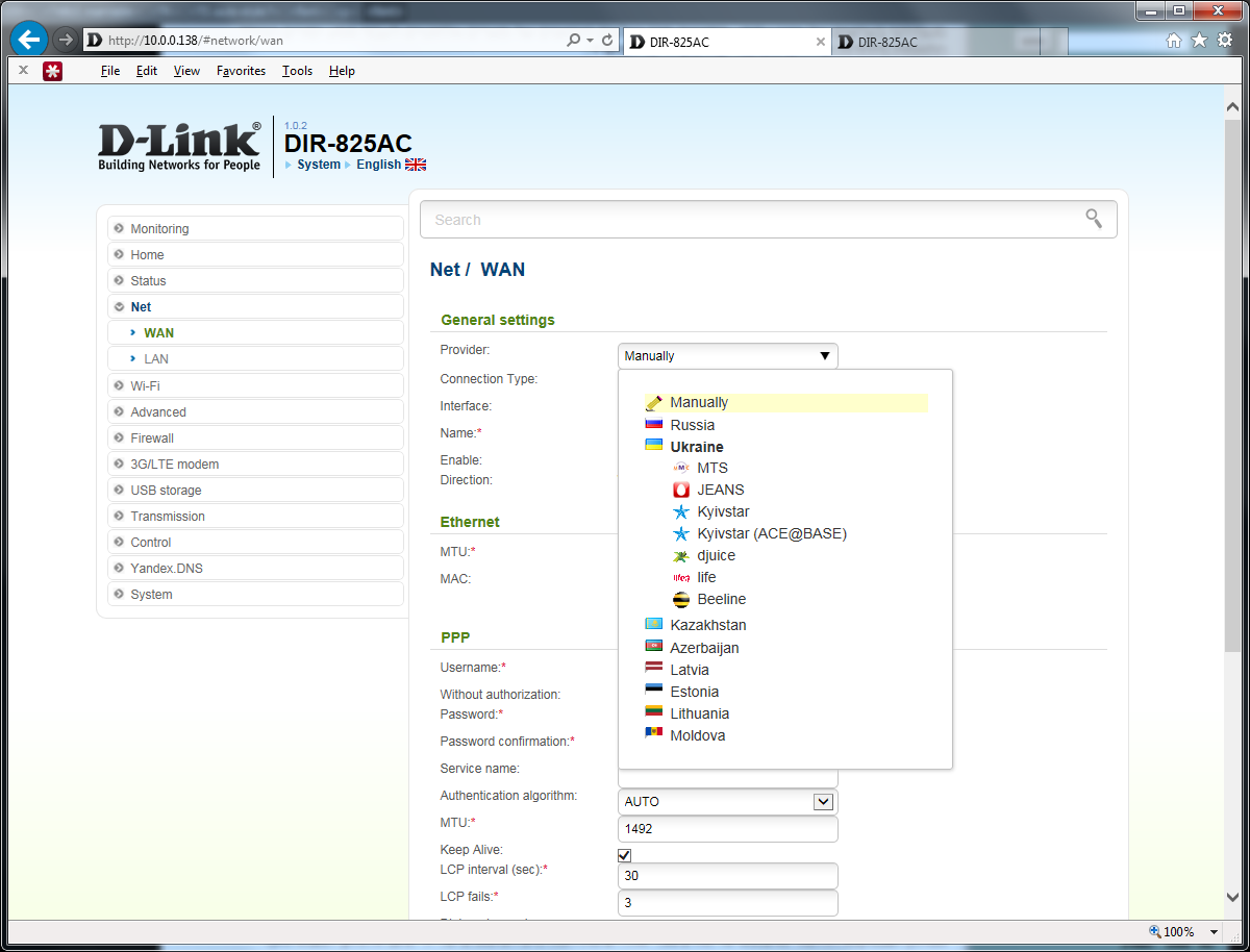 ישראל אינה מופיעה ברשימת המדינות ולכן יש לבצע הגדרה ידנית (Manually) ולבחור באופן פרטני את סוג החייגן ופרטי ההתקשרות. ה-DIR-825/AC תומך ברשימה ארוכה של חייגנים ובכלל זה dynamic IP ו-L2TP הנהוגים ברשת הכבלים ו-PPPoE הנהוג ברשת של בזק.