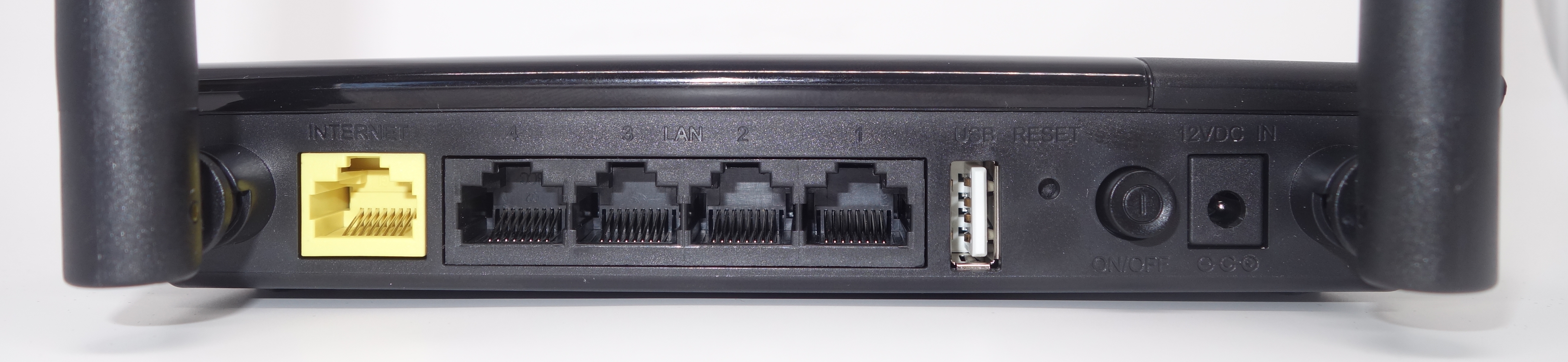 בחלק התחתון של התמונה, ניתן להבחין בחיבורים ובמפסקים הבאים (מימין לשמאל) — כניסת WAN (צהובה), 4 כניסות LAN (שחורות), כניסת USB, כפתור RESET, מפסק ON/OFF וכניסת מתח. בחלק העליון, מצד שמאל, ניתן להבחין בלחצן קטן – זהו לחצן ה-WPS שבפועל נמצא בחלקו הקדמי-שמאלי של הנתב.