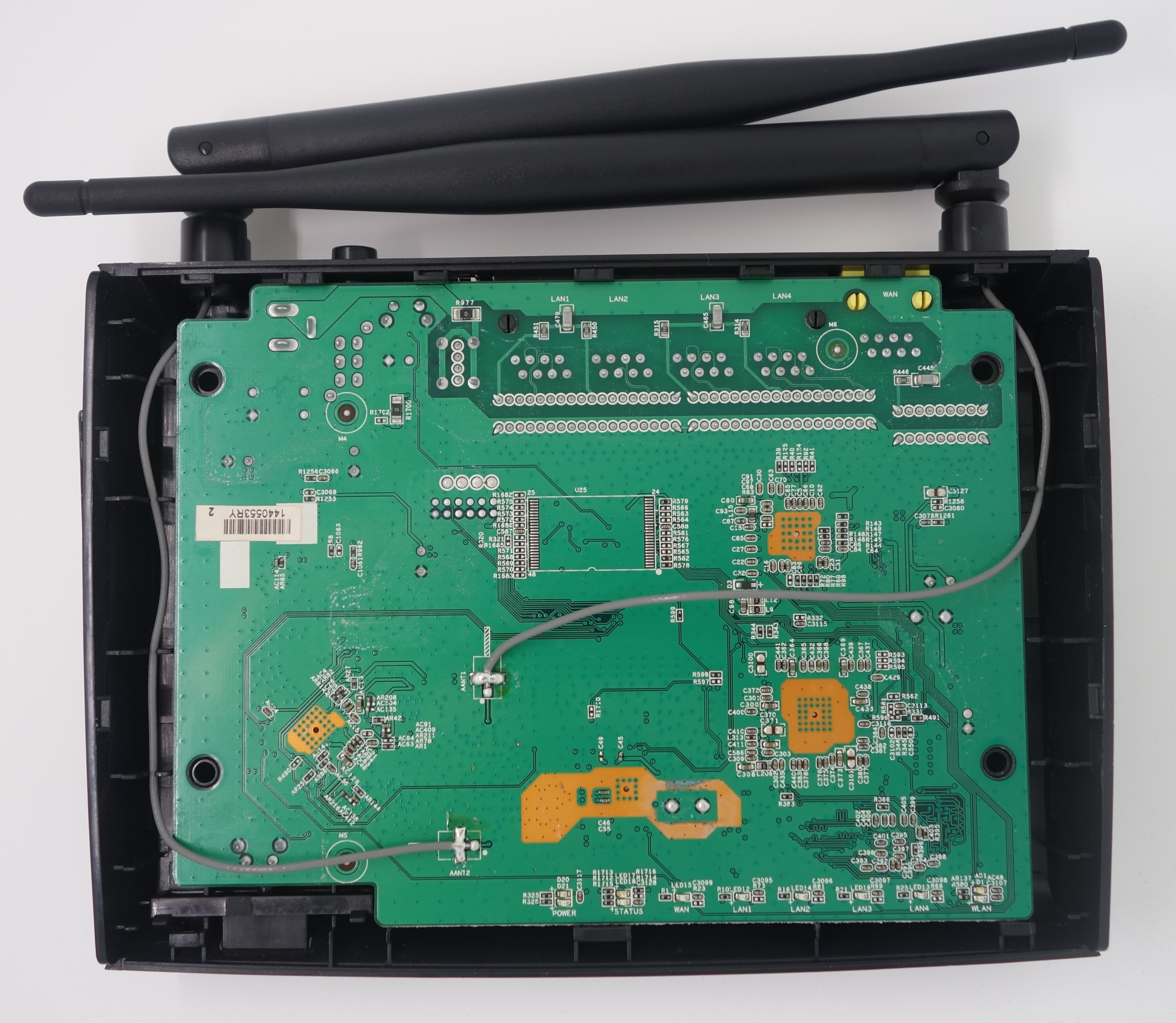 על מנת לפתוח את ה-DIR-825AC יש לשחרר 4 ברגי פיליפס פשוטים הנמצאים מתחת לרגליות הגומי של הנתב. לאחר הסרת הכיסוי העליון נחשף גבו של הלוח האלקטרוני של הנתב. כפי שניתן לראות בתמונה למטה (להגדלה – יש ללחוץ עליה), בצד זה ממוקמים חיבורי האנטנות ובחלק התחתון ניתן להבחין ב-8 נוריות LED. משמאל לימין: