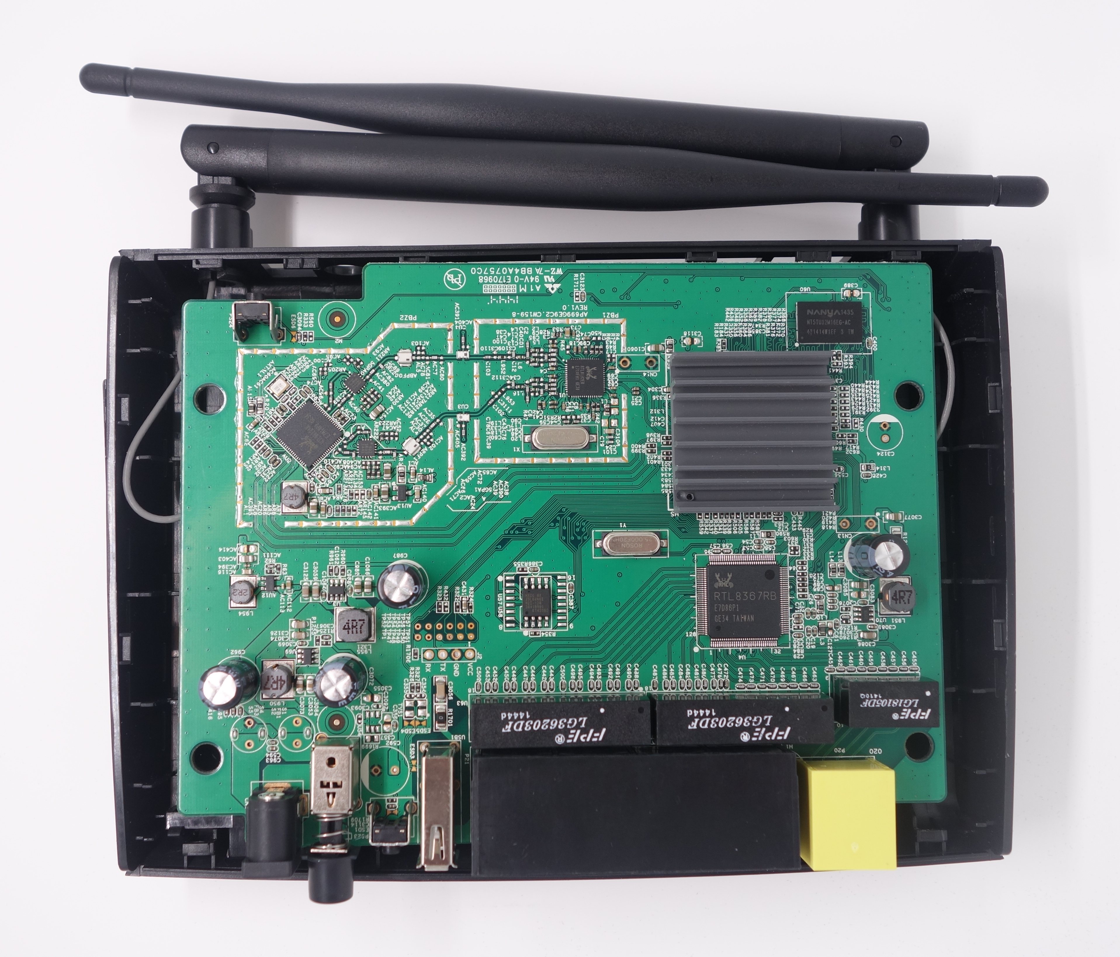 מתחתיו נמצא הרכיב RTL8367RB המנהל את הפורטים של הנתב. רכיב זה מסוגל לנהל עד 7 פורטים, כולם במהירות של 1G.