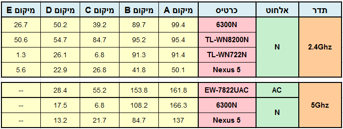 - בבדיקת ביצועים זו, בה נעשה לראשונה שימוש בכרטיס TL-WN8200N, מוכיחה את החשיבות של כרטיס רשת עם אנטנות חיצוניות משמעותיות. התוצאות שהושגו עם כרטיס זה היו טובות מאוד בכל המיקומים שנבדקו.