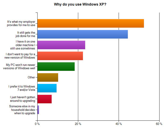 סקר שערך אתר Tehcnologizer לפני שנתיים בנוגע לשימוש במערכת ההפעלה XP מראה כי חלק גדול מהנשאלים משתמשים בה כי זו מערכת ההפעלה שהמעסיק מספק להם. כשנשאלו האם ישדרגו את מערכת ההפעלה, השיבו 34% מהנשאלים כי כן במידה והמעסיק יעשה זאת. המצב היום לא שונה בהרבה, ולכן מי שיהיה חשוף במיוחד לפרצות לאחר הפסקת העידכונים יהיו דווקא בתי העסק שעוד לא שידרגו את מערכת ההפעלה.