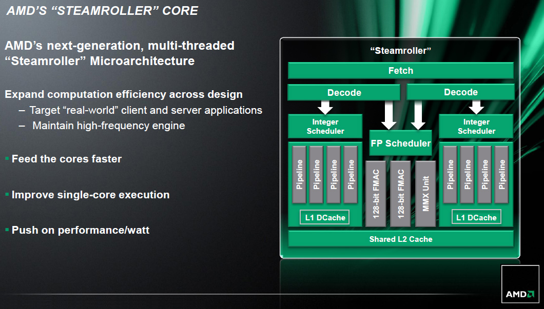 מעבדי סדרת Steamroller צפויים לצאת כבר השנה אל אוויר העולם ולתת ביצועי ליבה בודדת גבוהים משמעותית, אותו עקב אכילס של שני דורות המעבדים הקודמים.