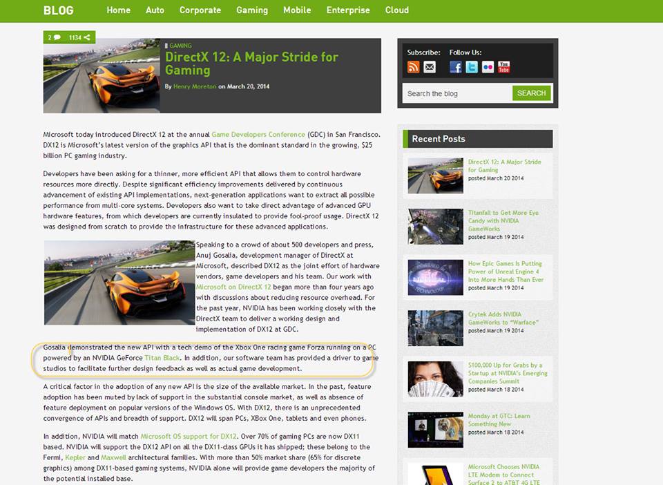 בתמונת בלוג של NVIDIA ישנה, פליטת פה מסגירה שהדגמת Forza 5 נעשתה למעשה במערכת מחשב מתקדמת הנושאת את המפלצת הגרפית Geforce GTX TITAN Black. משמע, לא רק שמיקרוסופט השתמשה בחומרת מחשב אישי כדי להדגים יכולת ששייכת לקונסולה, אלא גם עשתה זאת בשימוש כרטיס המסך עם הליבה הגרפית החזקה בעולם.
