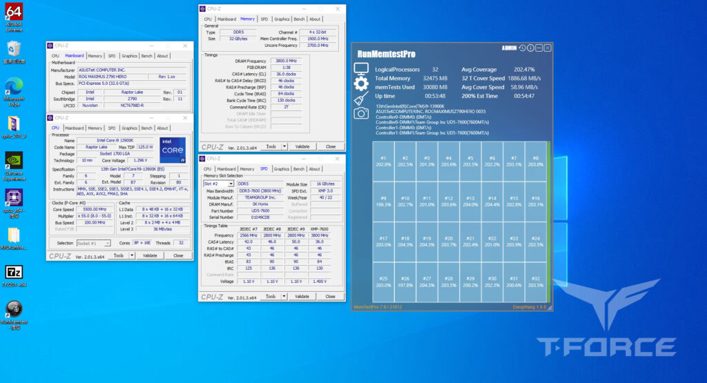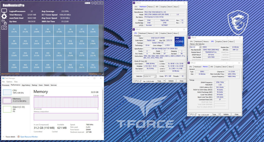 הצלע השלישית במרדף אחרי ביצועי DDR5 מירביים היא חברת Team Group, שהוסיפה אל משפחת T-Force Delta RGB שלה סטים כפולים עם מהירות מאומתת של 7,600MT/s עם נפח 32GB, שאותם היא בדקה עם לוחות Z790 עדכניים משלושת השמות הגדולים בעסק – אסוס, GIGABYTE ו-MSI, תחת תזמוני 36-46-46-84 (CL, tRCD, tRP, tRAS) במתח בסיס של 1.4 וולט.