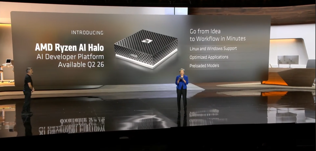 ב-AMD רוצים לקדם את העניין של מחשוב חזק וקומפקטי, וד"ר סו הציגה גם פלטפורמת פיתוח עבור מחשבי ה-Ryzen AI Halo של AMD. הרעיון מאוד דומה לרעיון שאותו אפל מממשת עם מחשבי ה-Mac Mini שלה – מחשב קומפקטי שמבוסס על סופר-שבב אחד, שבב שמכיל גם מעבד רב-ליבות וגם ליבה גרפית מתקדמת במיוחד.