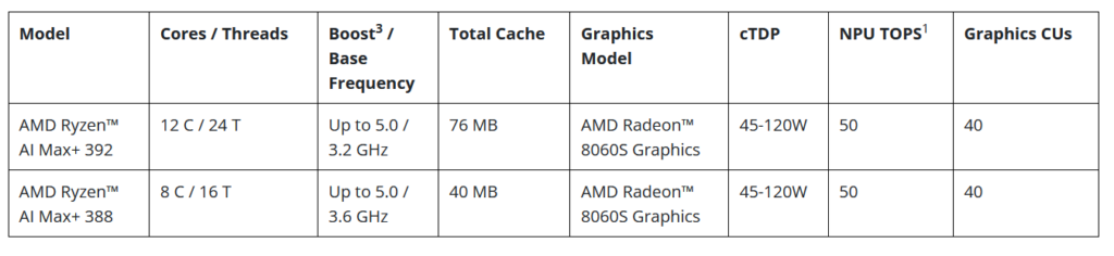 אל Ryzen AI MAX+ 395 שהושק שנה שעברה מצטרפים דגמים בשם 392 ו-388 שמגיעים עם 12 ו-8 ליבות בהתאמה. ה-395 נשאר ספינת הדגל ונושא איתו 16 ליבות מסוג Zen 5 עם 32 נימים. לכל הסדרה הזאת אותה הליבה הגרפית מדגם Radeon 8060S. זאת ליבה גרפית מבוססת RDNA 3.5 והיא מכילה 40 קבוצות עיבוד. ההרכב החומרתי שלה מזכיר קצת את קונסולת Playstation 5. יש שם המון כח גרפי, אמנם ישנו שימוש בזיכרון DDR5 סטנדרטי, ולא בזיכרון GDDR6 מהיר במיוחד כמו בקונסולה.
