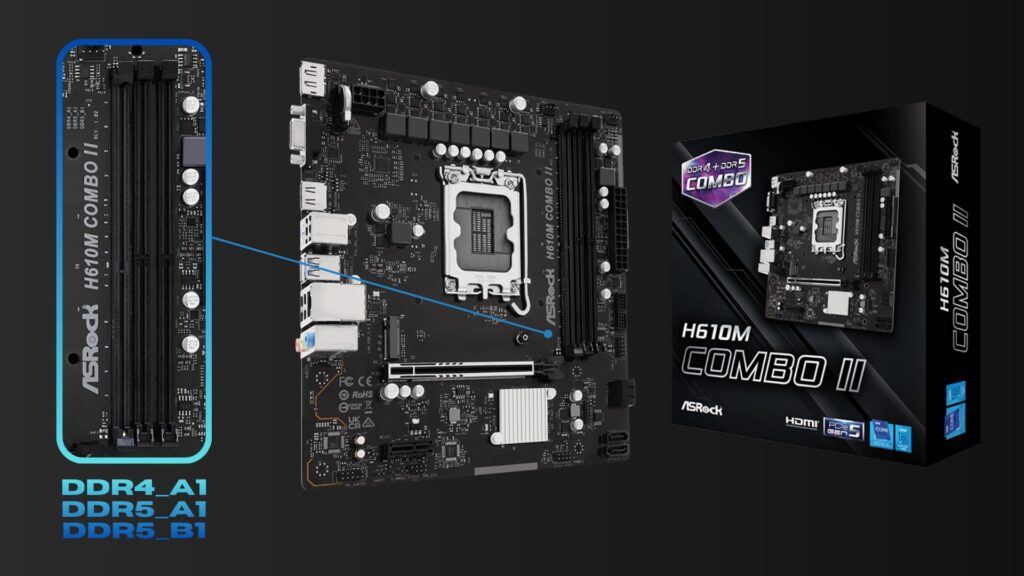 התכונה המרכזית של ה-H610M Combo II היא מערך חריצי הזיכרון שלו. הלוח כולל שלושה חריצי DIMM בסך הכל: שניים המיועדים לזיכרון מתקן DDR5 ואחד המיועד ל-DDR4. הנדסת הלוח אינה מאפשרת הפעלה מקבילה של שני התקנים יחד, כך שהמשתמשים נדרשים לבחור באיזה סוג זיכרון להשתמש בעת ההרכבה. חריץ ה-DDR4 הבודד ממוקם קרוב למעבד ותומך בנפח של עד 32 גיגה-בייט במהירות מקסימלית של 3200 MT/s. מכיוון שמדובר בחריץ יחיד, הזיכרון יפעל בערוץ בודד (Single Channel), עובדה המהווה פשרה ביצועית מסוימת עבור תקן זה, שבאופן מסורתי נהנה מיתרון משמעותי בתצורת ערוץ כפול.