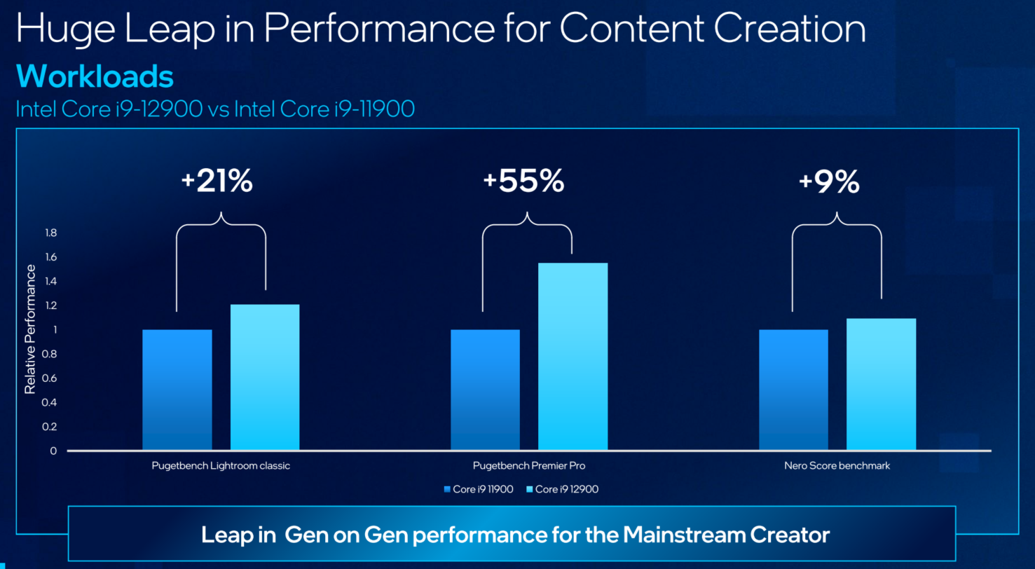 אנחנו מקבלים מאינטל טיזר למה לצפות מהמעבדים הנעולים החדשים כאשר ישנה השוואה כללית בין Core i9 12900 לבין Core i9 11900. להזכירכם, כמות משאבי הליבות ב-Core i9 12900 גבוהה משמעותית כאשר הוא נהנה מ-8 ליבות גדולות בנוסף ל-8 קטנות בעוד ב-Core i9 11900 שמונה ליבות דור קודם בלבד.