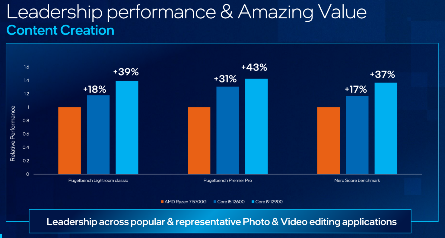 ישנה גם השוואה כללית אל מול ה-Ryzen 7 5700G, מעבד אמצע השוק מתומן-הליבות של AMD. אינטל לא מפחדת להכריז ש-Core i5 12600 בעל שש ליבות ה-Performance יהיה אחד מהמעבדים המשתלמים ביותר ליוצרי תוכן.
