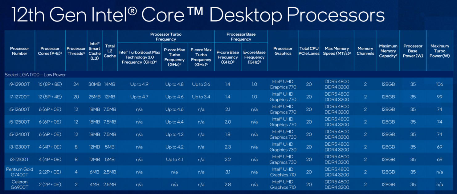 כבר זכינו להכיר את המעבדים Core i9 12900K, Core i7 12700K ו-Core i5 12600K בעלי יכולות האוברקלוקינג ומעטפות החום המופרעות בהתאם. כעת מגישה אינטל מעבדים נעולים בעלי מעטפות חום נשלטות הרבה יותר – 22 המעבדים החדשים צפויים לשרת את נתחי השוק הפופולריים ביותר של קהל משתמשי המחשבים הנייחים.