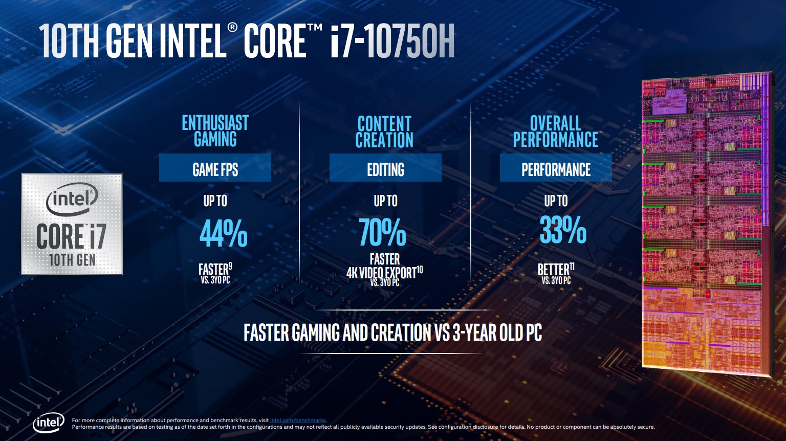 גם ה-Core i7 10750H צפוי להיות מעבד מאוד מעניין, היותו מכיל קונפיגורציה בריאה של 6 ליבות ו-12 נימים ותדר עבודה של עד 5Ghz, ככזה המתאים גם לגיימינג וגם לעבודה מקצועית. מדובר בתוספת של 500Mhz על פני Core i7 9750H, מעבד שכזה הפך לפופולארי אפילו בקטגוריות זולות יותר של לפטופים לגיימינג.