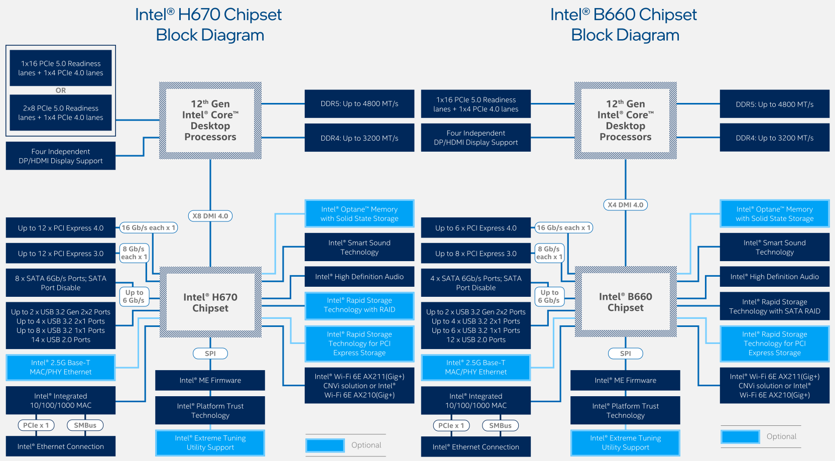 לפניכם דיאגרמות המשוות בין H670 לבין B660. ערכת השבבים B660 נולדה בשביל לשרת את שוק הביניים והיא צפויה להפוך לחביבה בעיקר בקרב גיימרים. ערכת שבבים זאת החלה את דרכה לעולם העסקים והמחשבים המשרדיים, אך בשל כך שגיימרים לא זקוקים לכמות גדולה של יציאות USB מהירות, אנחנו נוכל למצוא בקרוב על המדפים לוחות אם לגיימינג אשר מבוססים על ערכת שבבים זאת.