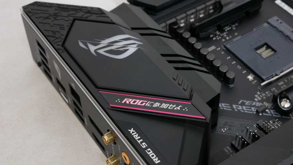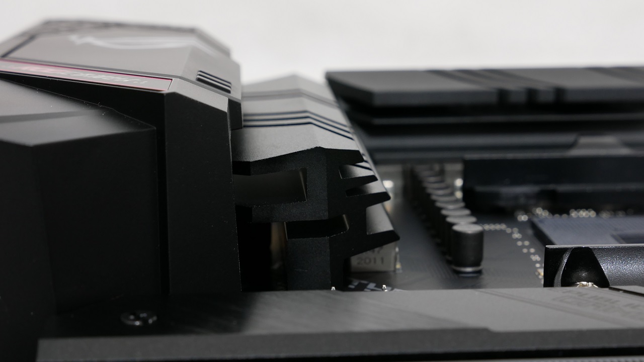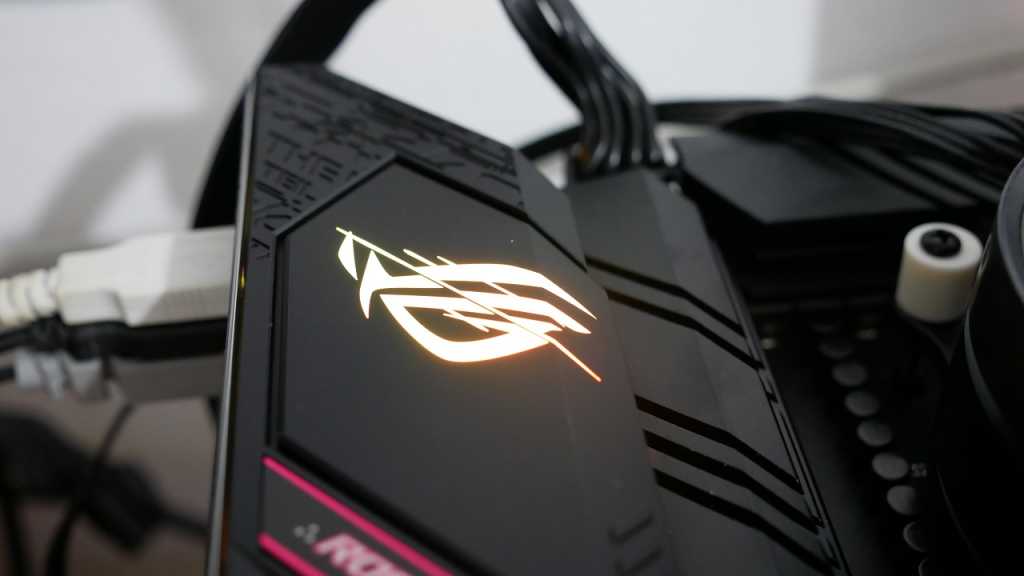 יש גם RGB בדמות לוגו ROG מעל גופי הקירור של מייצבי המתח. ניתן לשלוט על התאורה של הלוגו דרך תוכנת Aura של אסוס.