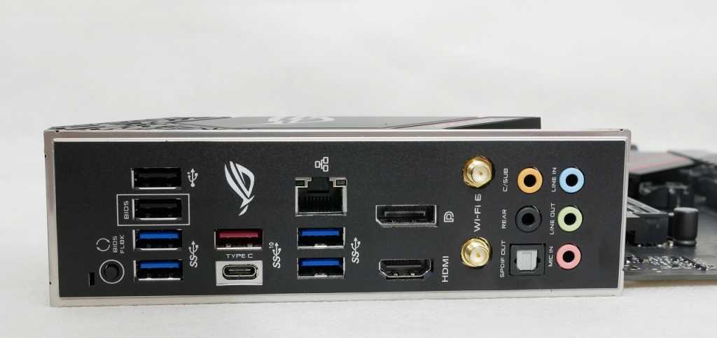 מלבד ממשקי האודיו המוכרים, ישנן יציאות תצוגה מסוג HDMI 2.1 ו-DisplayPort 1.2 שישמשו למעבדים בעלי ליבות גרפיות מובנות שיושקו בעתיד. יציאת הרשת הינה במהירות 2.5Gbps על בקר i225-V של אינטל. ארבע יציאות ה-USB בכחול הינן במהירות 5Gbps, בעוד זאת באדום וב-Type-C הינן במהירות 10Gbps. שתי יציאות ה-USB השחורות הינן בתקן 2.0 הותיק ומומלצות לציוד היקפי בעיקר. ישנו כפתור איפוס ביוס בצמוד, וחיבור לאנטנת ה-Wifi שמגיעה באריזה. ה-Wifi הינו על בסיס בקר AX200 מתקדם, ויש גם Bluetooth בתקן 5.1.