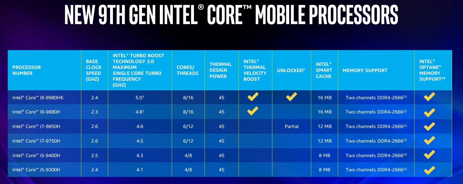 סדרת המעבדים החדשה כוללת רענונים לדגמים קיימים ושיפור תדרי פעולה בהשוואה לסדרה הקודמת, ממש בדומה לדור 9 לעומת דור 8 בשוק המחשבים הנייחים. את Core i7 8850H הקיים מחליף Core i7 9850H וכך גם עם דגמים נוספים.