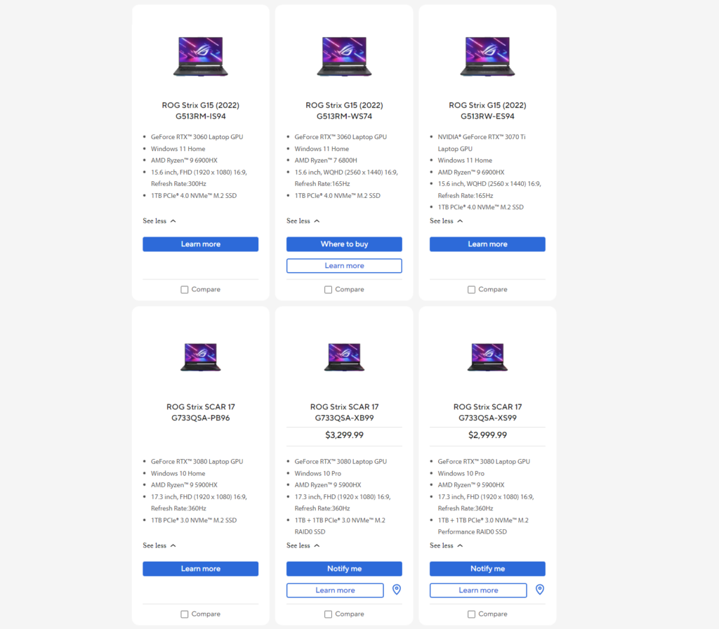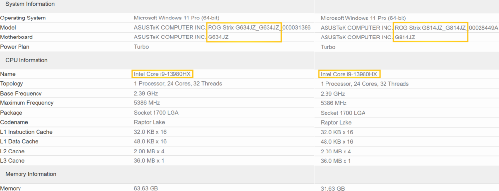 אסוס השיקה אמנם ניידי גיימינג מתקדמים עם מסך של 16 אינץ' במסגרת מותג ה-Zephyrus שלה, אך לא תחת מותג ה-ROG Strix (שמגיע עם תוספת המותג SCAR, או עם תוספת האות G בשוק הלפטופים) – וזה משהו שלכאורה ישתנה בתקופה הקרובה, אם לשפוט לפי התיעודים של הדגמים עם השמות ROG Strx G634JZ ו-ROG Strix G814JZ, עם תדר פעולה מירבי של 5.386GHz (שנמוך יותר מהמקסימום המדווח עבור ה-Core i9-13980HX, כאמור) ועם 32GB או 64GB של זכרון דינאמי פנימי.