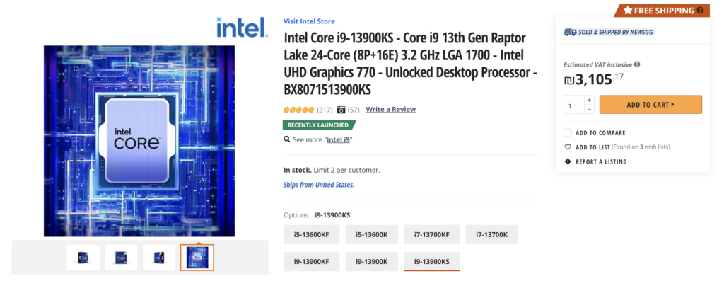 ה-Core i9-13900KS כבר זמין לרכישה בחנות המקוונת של Newegg כולל משלוח חינם לישראל, במחיר בסיס מוגדל שווה ערך לכ-777 דולר ובמחיר סופי של 912 דולר לערך כאשר מוסיפים את המע"מ – או 3,116 שקלים, כאשר באותה נשימה נראה כי יש כבר כמה חנויות חומרה מקומיות שמציגות אותו באתר שלהן, במחירים שמתחילים מ-3,260 שקלים לערך. תוספת של כ-23 אחוזים למחיר המקומי המינימלי עבור ה-Core i9-13900K, במהדורת ה-Box שלו.