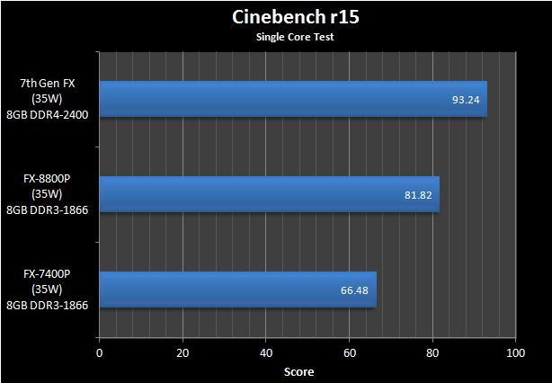 בין המבחנים השתתפו גם שבבי 15 וואט למחשבים ניידים. בין המובילים של אינטל ניתן למצוא את ה-Core i7 6500U הפופולארי שכולל 2 ליבות ו-4 נימים. פה מדובר במבחן שממחיש בעיקר את ההבדלים בביצועי גרפיקה. כאן, ההפרש בין מעבד ה-APU החדש של AMD לבין Core i7 6500U הוא 50 אחוזים. חשוב להבין שאחד הגורמים לקפיצה הזאת הוא השימוש בזיכרון DDR4 לעומת DDR3 במעבד אינטל. הזיכרון הגרפי וזיכרון הראם משותפים.