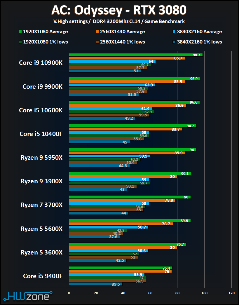 ב-Assassin's Creed Odyssey ביצועיו של ה-5600X מעט פושרים, אך עדיין בטווח יחסית קטן גם מהמהירים ביותר במשחק זה.