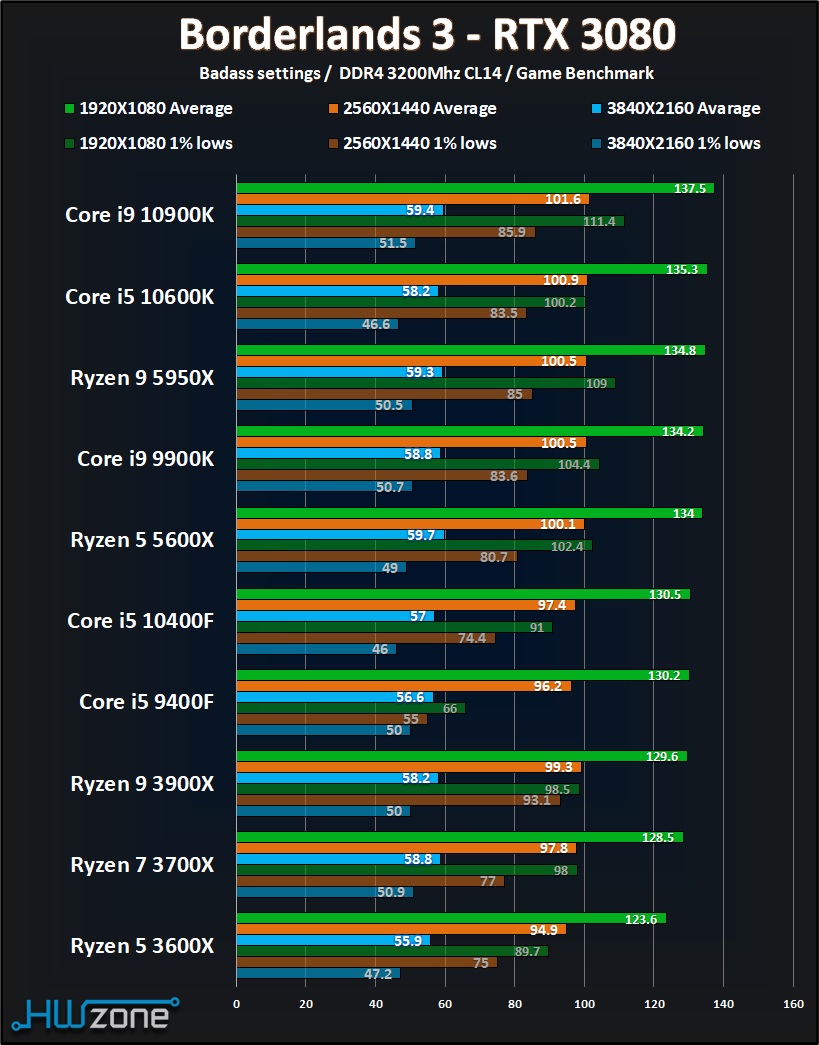 במשחק Borderlands 3, ביצועיו של ה-5600X זהים לאלו של ה-9900K וגם לאלו של ה-10600K.