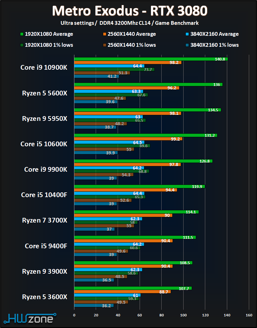במשחק Metro Exodus התובעני, מצליח ה-5600X להתברג בין 10600K לבין אחיו הגדול, ה-5950X, בעיקר בתלות ברזולוציה. נראה שהרכב הליבות הפשוט והישיר יותר של ה-5600X מקנה לו יתרון קל ב-FullHD.