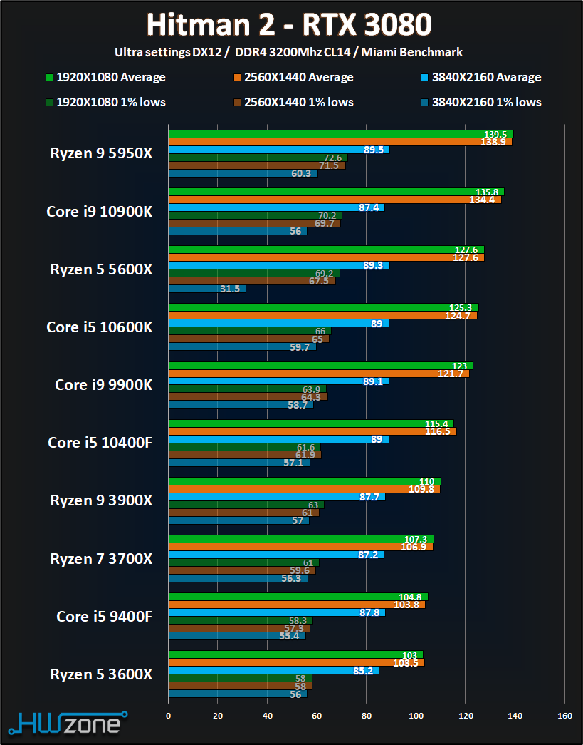 המשחק Hitman 2 הוא מבחן פנטסטי מבחינתנו למעבדים, שכן הוא נשען רבות על עוצמת עיבוד לצרכי הפקת כמות מירבית של פריימים לשניה, בעיקר ברזולוציות הנפוצות. כאן ימצא ה-5600X מאחורי 5950X ו-10900K. היתרון על פני 10600K הוא מזערי.