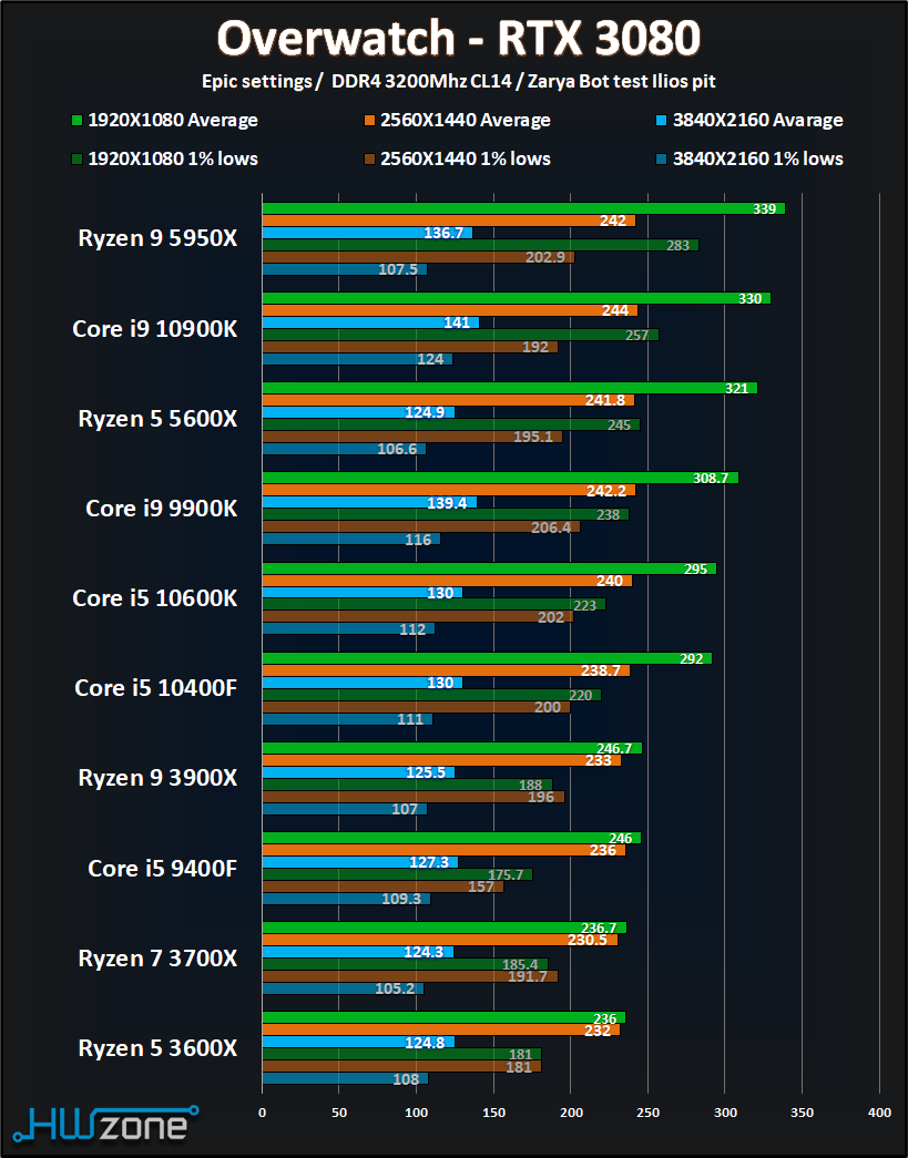 במשחק Overwatch ביצועיו של ה-5600X גבוהים למדי ואין לו בעיה להפיק כמות פריימים לשניה שגבוהה במעט מזאת של ה-9900K.