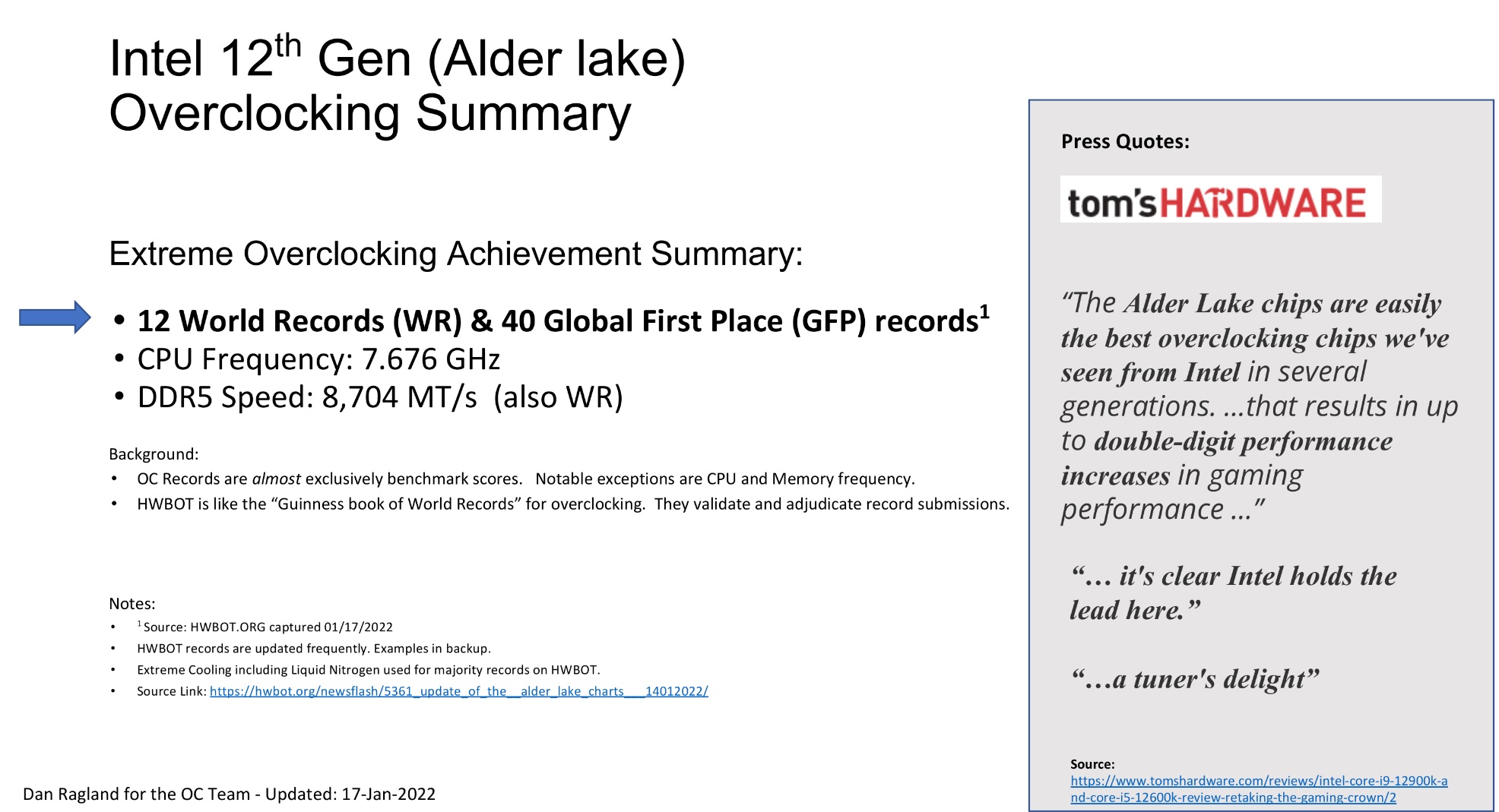 י.כ: אם נלך מספר דורות אחורה, אוברקלוקינג היה מאוד המשכי עם שינויים קטנים בין דור לדור החל מהשקת Skylake ועד היום. ב-Alder Lake עשו שינוי משמעותי לגישת האוברקלוקינג, נכנסו שינויים ארכיטקטונים רבים שנוגעים לאוברקלוקינג, החל מהאפשרות לאוברקלוקינג בליבות הקטנות דרך שינויים משמעותיים בגזרת הזכרון ועד לשינוי תדר BCLK (תדר בסיס) פנימי. שינויים אלו יחד עם שיפורים רבים ברמת הביצועים של הליבות, ממתגים את Alder Lake כמעבד האורקלוקינג הטוב בעולם כיום. כתוצאה מכל זה בהחלט רואים שיפור הדרגתי בשיאים שכן אוברקלוקרים לומדים להכיר את הארכיטקטורה החדשה וכל השיפורים שהטמענו בפלטפורמה. שיאי אוברקלוקינג ימשיכו להשבר, יש עוד הרבה לאן לשאוף.