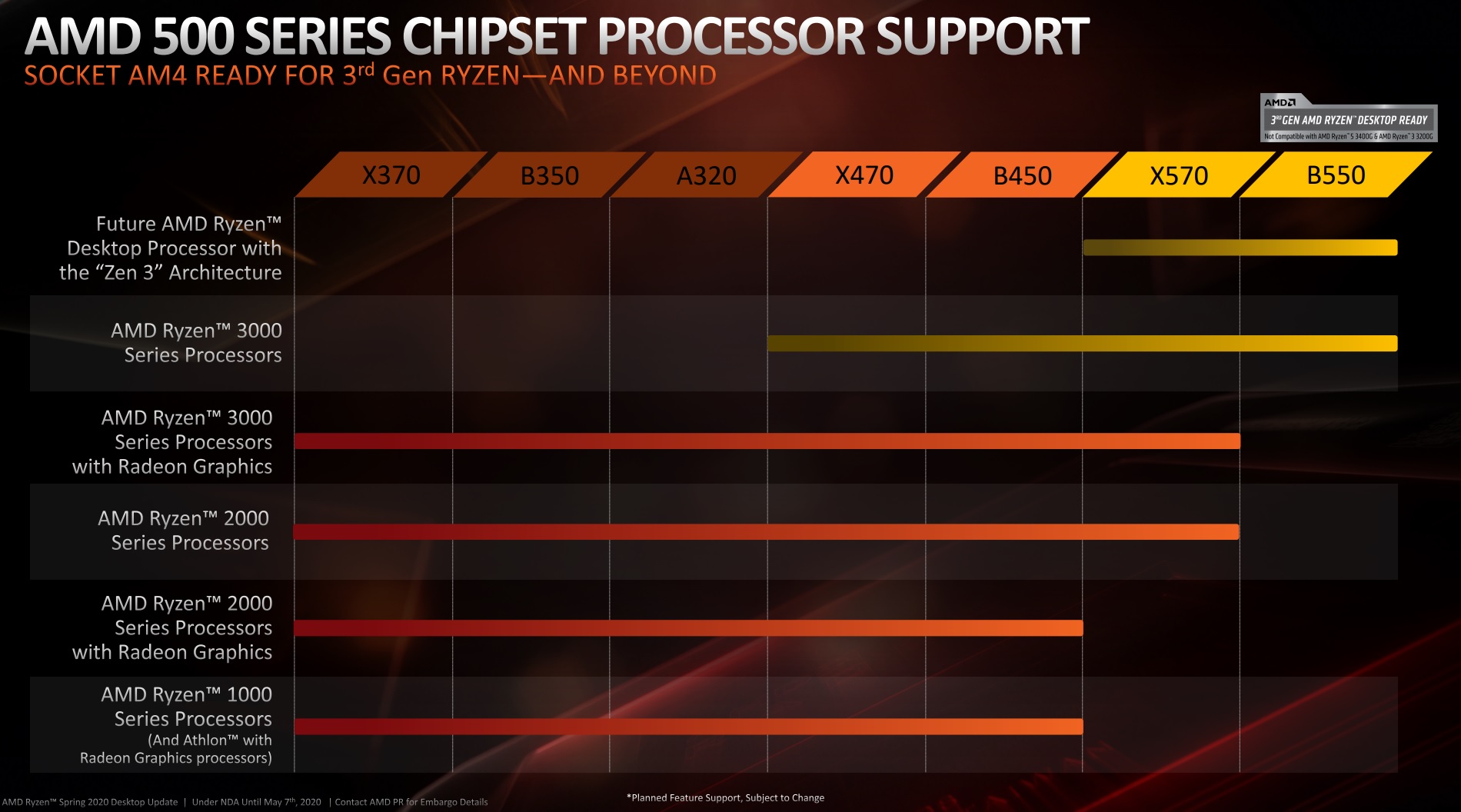 לפניכם שקף שמציג את היחס בין תמיכת ערכות שבבים לבין סדרות מעבדים. נכון לרגע זה החדשות המרעישות הן שהתמיכה במעבדי Zen 3 (אשר יקראו גם Ryzen 4000) תשמר אך ורק לערכות השבבים מסדרת 500. משמעות הדבר היא שלא צפויה תמיכה במעבדים אלו לבעלי לוחות אם מבוססי B450 ו-X470.