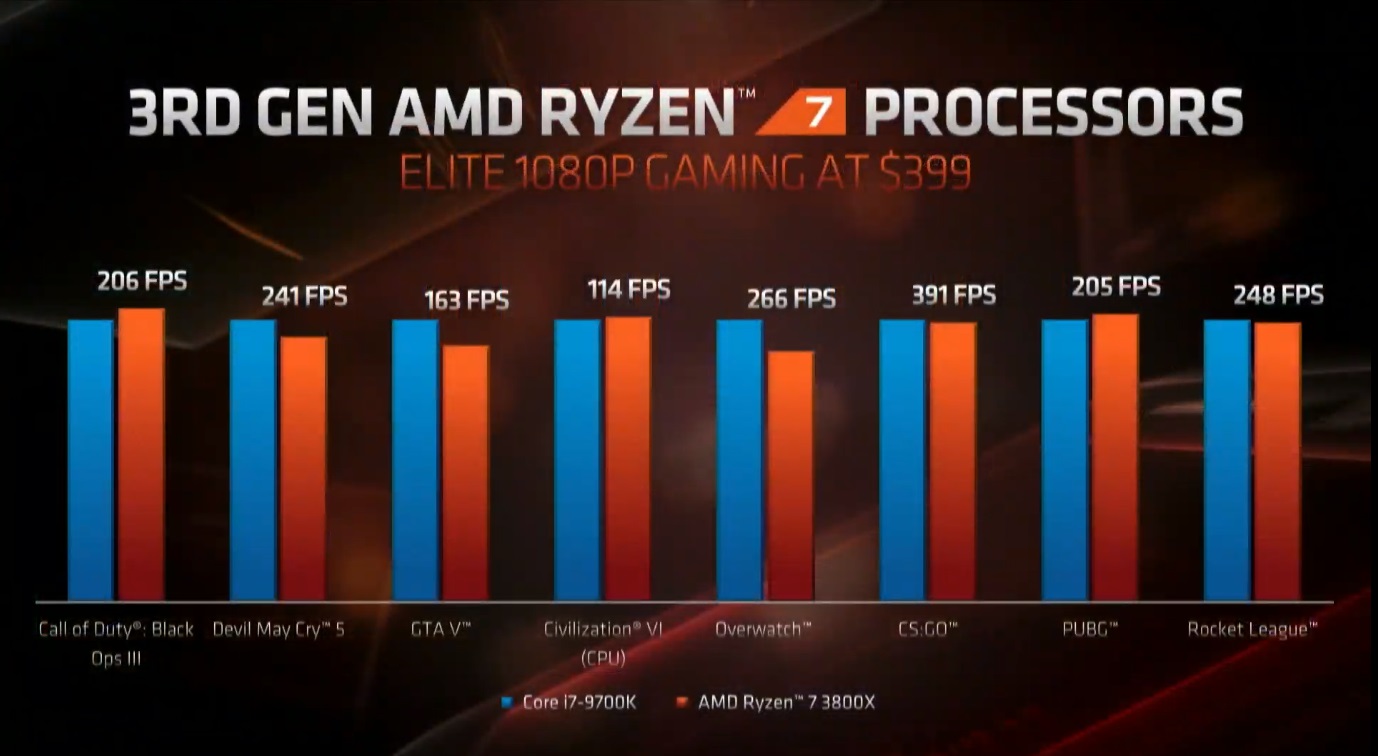 ה-Ryzen 7 3800X הוא מעבד בעל 8 ליבות המתחרה ישירות בקטגוריית ה-400 דולר מול ה-Core i7 9700K. גם כאן נצפו ביצועי גיימינג לא רעים במעבדי AMD כאשר היוצא מן הכלל הוא Overwatch עם ביצועים שנשארים מעט נמוכים בצד של AMD כמו בדורות הקודמים בהשוואה.