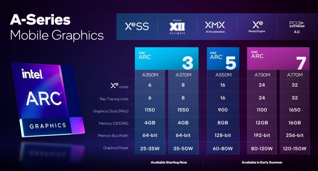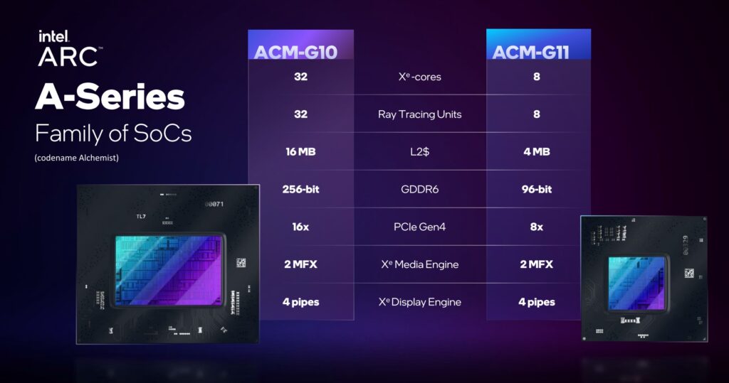 קו מוצרי סדרת A החדשה של אינטל למחשבים ניידים בנוי ומבוסס על שני שבבים אותם אינטל מייצרת – ה-ACM-G10 וה-ACM-G11. האחד ישרת את הניידים המתקדים ליצירת תוכן וגיימינג כאשר השני הרזה יותר ישרת את סוגי הניידים קלי המשקל ובעלי היעילות החשמלית המוגברת.
