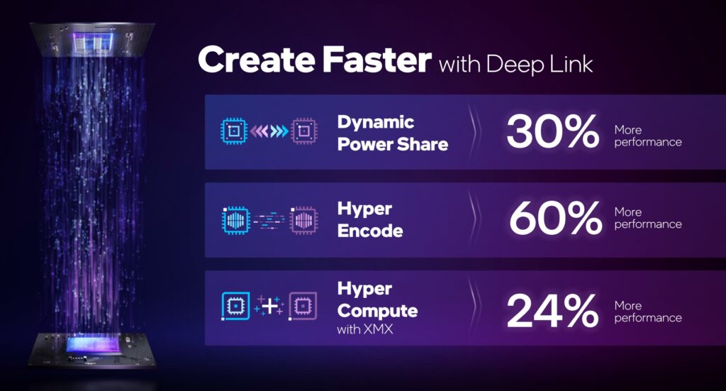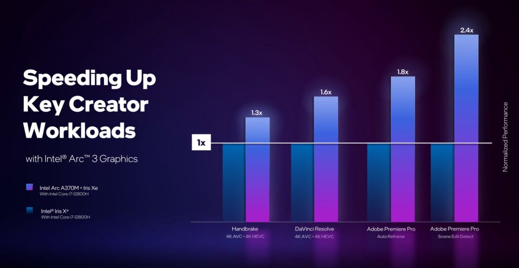 אלו הן טענות שיפור הביצועים של אינטל בשימוש הטכנולוגיות ההיברידיות שמשלבות בין הליבה הגרפית המובנית במעבד לבין כרטיס מסך מוקדש. כתוצאה מכך אמור להיות ברור למדי כי לאינטל חשוב שכרטיסי המסך החדשים שלה יבלו בעיקר במחשבים בעלי מעבד ראשי של אינטל גם כן, ועדיף עם ליבה גרפית מובנית משלו בנוסף.