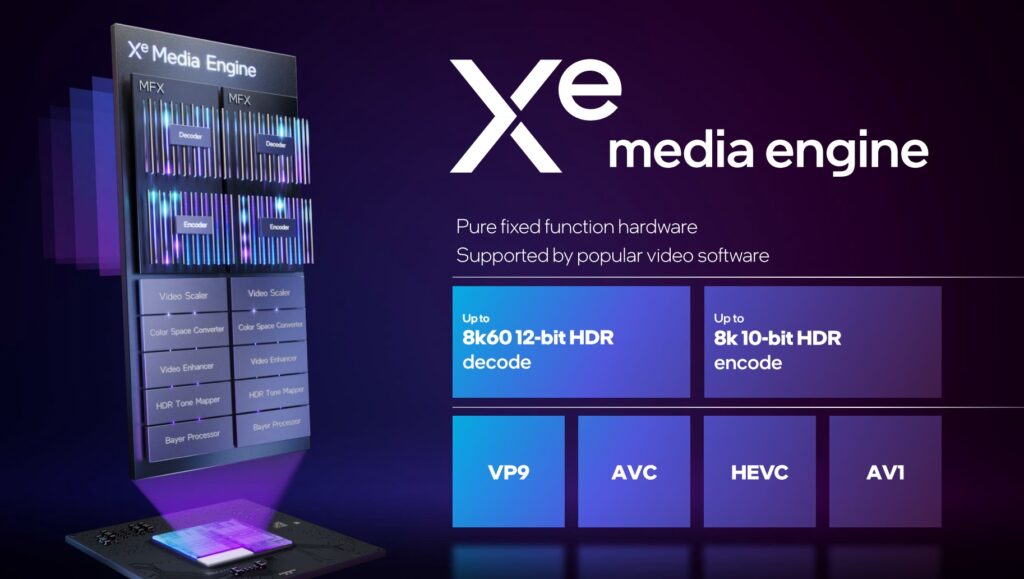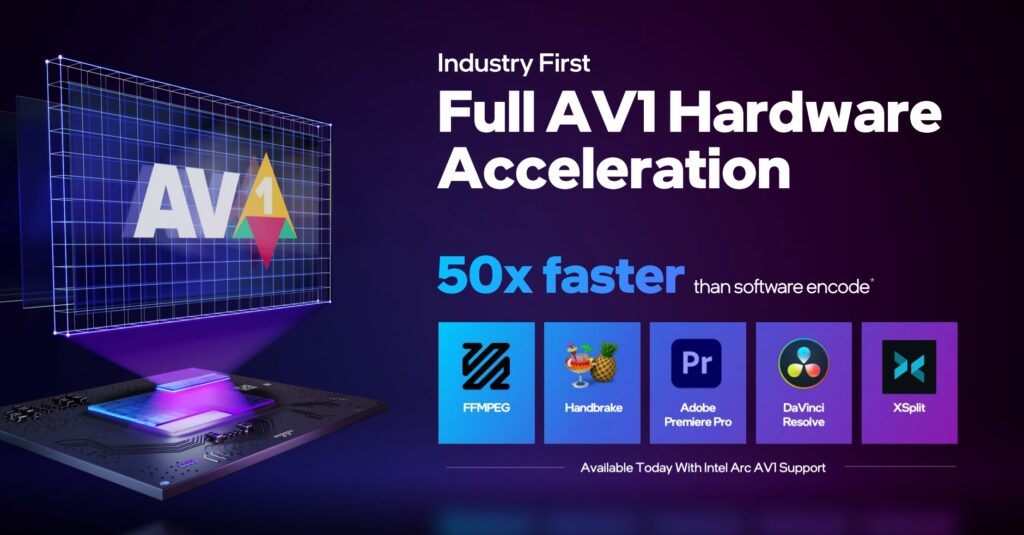 אינטל שמה בצדק דגש על מקודד AV1 הפתוח שהופך אט-אט לפופולרי הודות לתכונות הטכניות ויעילותו. AV1 צפוי בהדרגה להפוך למקודד בו משתמשת גוגל עבור כל התוכן בהבחנה גבוהה ב-YouTube ולהחליף את VP9 הקיים. אינטל מציינת כי האצה בשימוש החומרה החדשה מהירה פי 50 מזאת ללא האצת חומרה כלל, אמנם חשוב לציין כי רוב מאיצי הגרפיקה מהשנים האחרונות מאיצים AV1 במהירות כזאת או אחרת חומרתית.