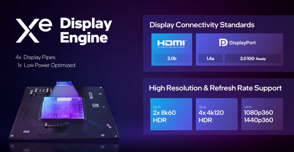מנוע התצוגה של אינטל קיבל מתיחת פנים קלה גם כן. התמיכה בתקן HDMI נשארת בתחום 2.0 וזאת ב-DisplayPort תהיה לתקן 1.4a או 2.0 במגבלת תעבורה ספציפית. הממשקים הללו מספיקים בשביל לתמוך גם בתצוגות המתקדמות ביותר שזמינות למשתמש בטיפוסי, ולכן זו לא דאגה כלל. ניתן לחבר צמד מסכי 8K60 או ארבעה מסכי 4K120 לכרטיס המסך של אינטל.