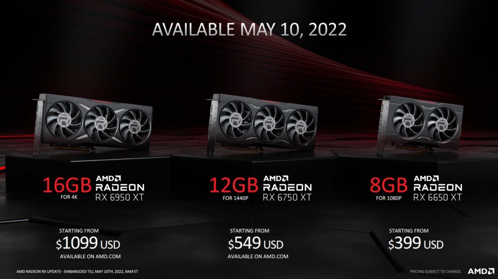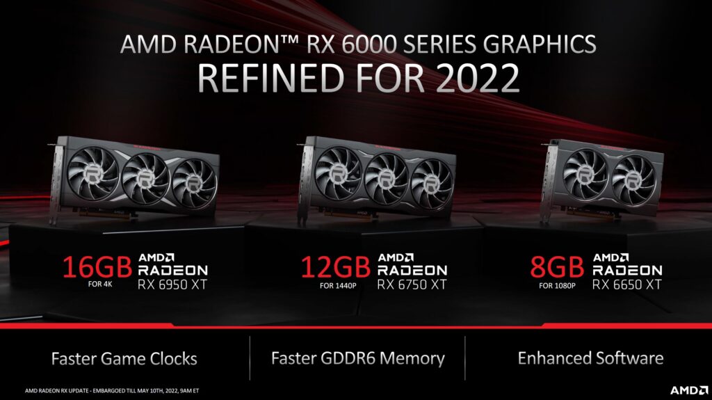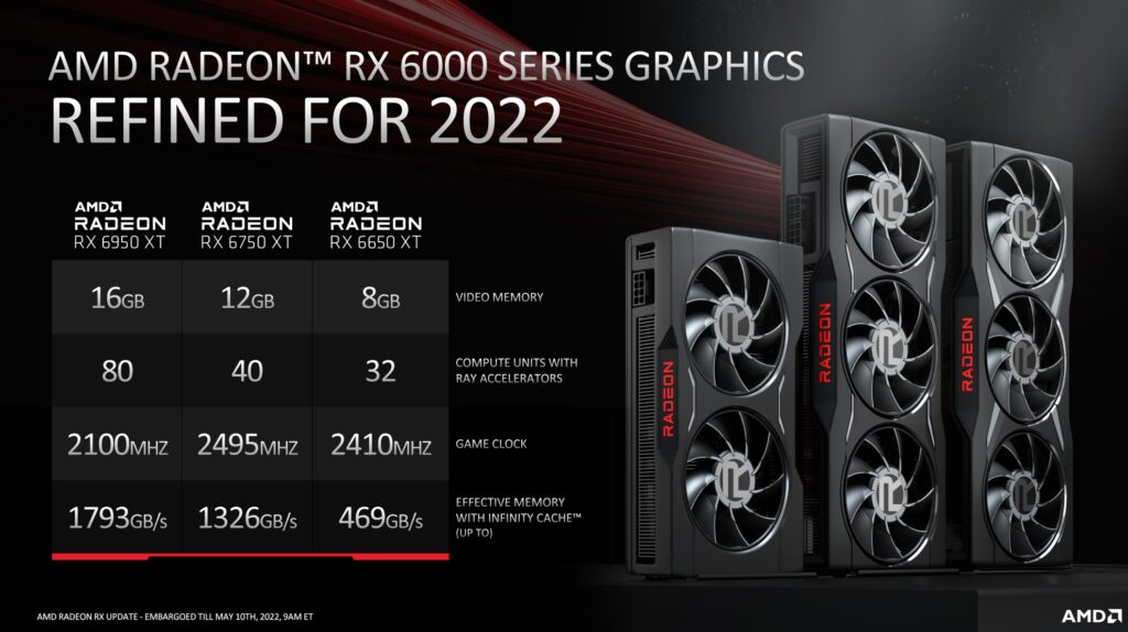שלושת כרטיסי המסך שהופכים כעת לזמינים הם ה-Radeon RX 6950 XT, RX 6750 XT ו-RX 6650 XT. מדובר למעשה בשלושה ריענונים למוצרים קיימים, שהם ה-RX 6900 XT, RX 6700 XT ו-RX 6600 XT בהתאמה.