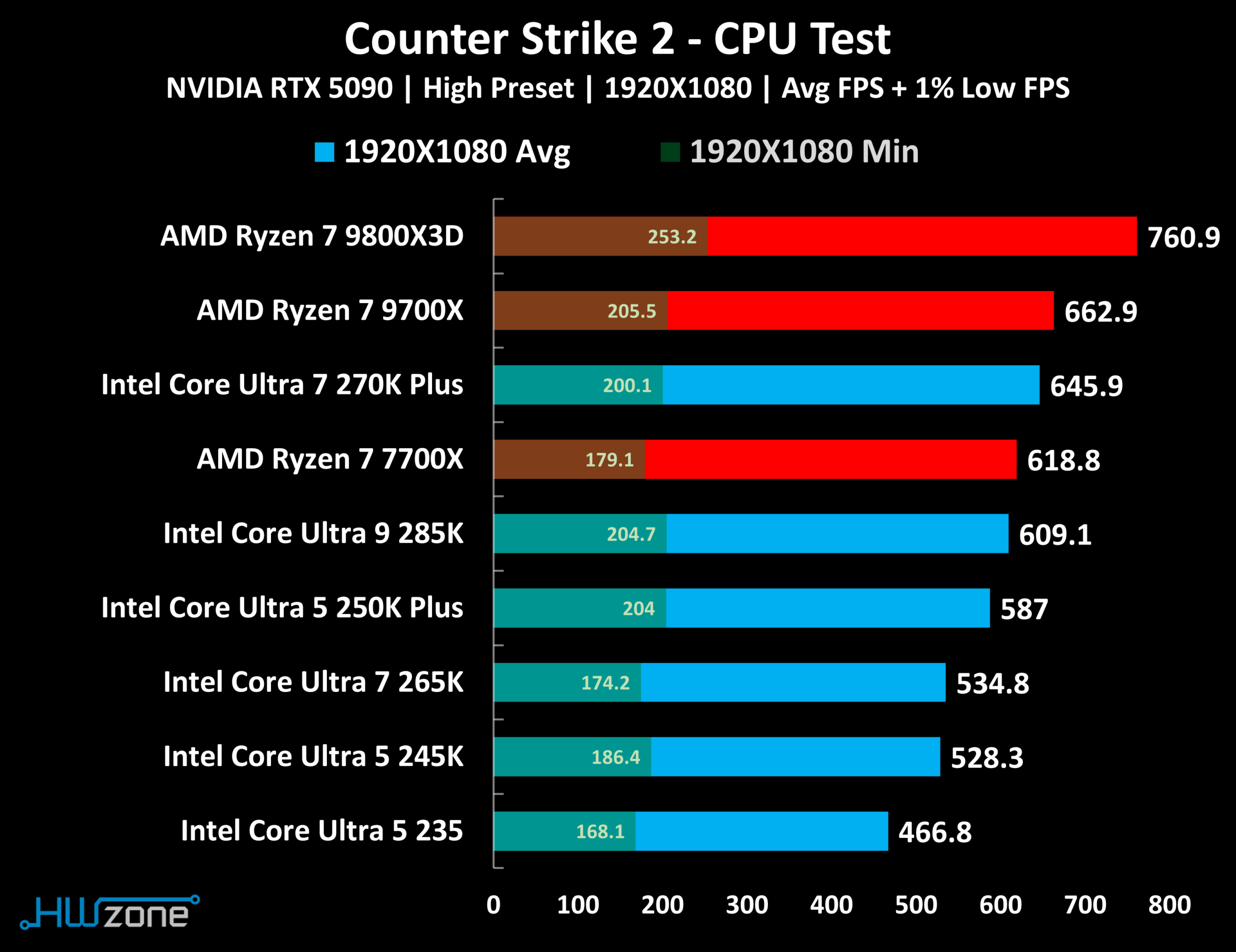 Counter Strike 2 הוא כותר שאוהב את מעבדי AMD החדשים ורואים זאת עם הובלה של 9700X על פני 270K Plus. אמנם, לא מדובר בהובלה גדולה כלל. תראו כמה נמוך נמצא 265K לעומת 270K Plus כאן. ניכר השיפור. יש גם עקיפה של 285K.