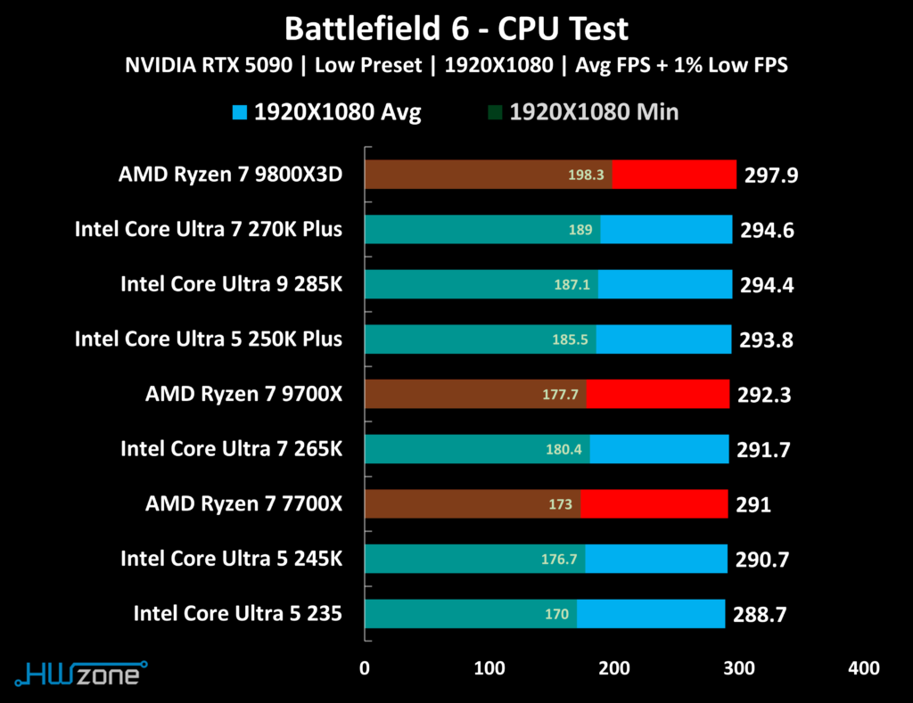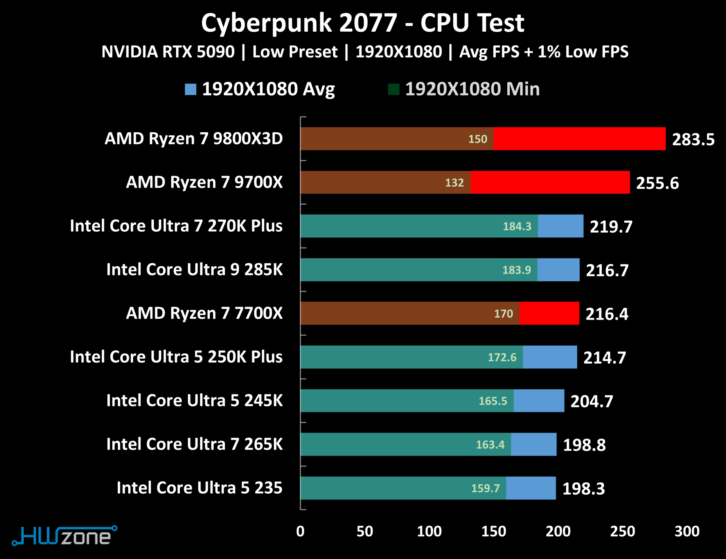 המבחן הראשון נשאר מבחן מאוד אינטנסיבי בתלות על כרטיס המסך, אפילו כשבוחנים אותו ברזולוציה נמוכה ובהגדרות נמוכות. יש לצפות להובלה של Ryzen 7 9800X3D בכל מבחני הגיימינג. אחרי הכל, הוא גם יקר משמעותית וגם מהיר משמעותית מכל דבר שיש לאינטל להראות בריענון הזה. טכנית, אחריו ראינו את 270K Plus החדש, לא רע.